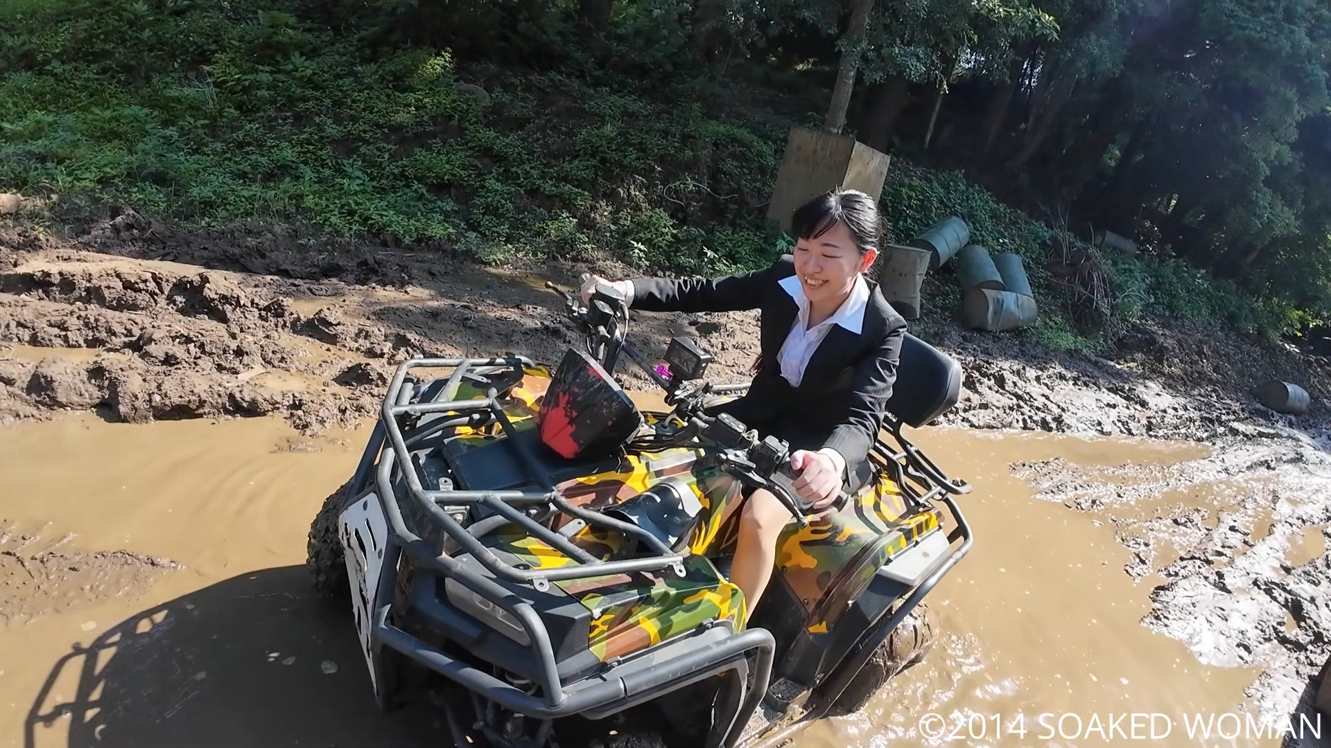 スーツ姿のOLさんが、4輪バイクでコースを走行。