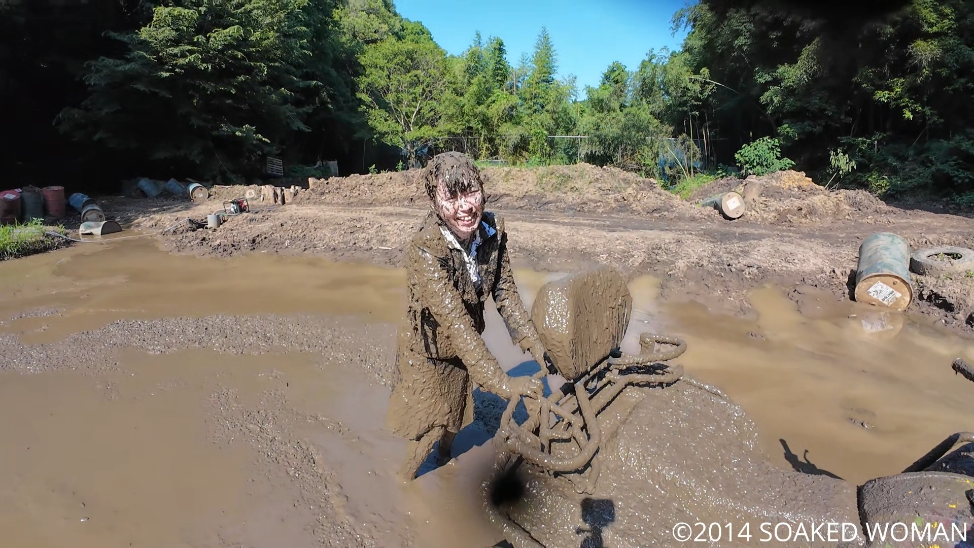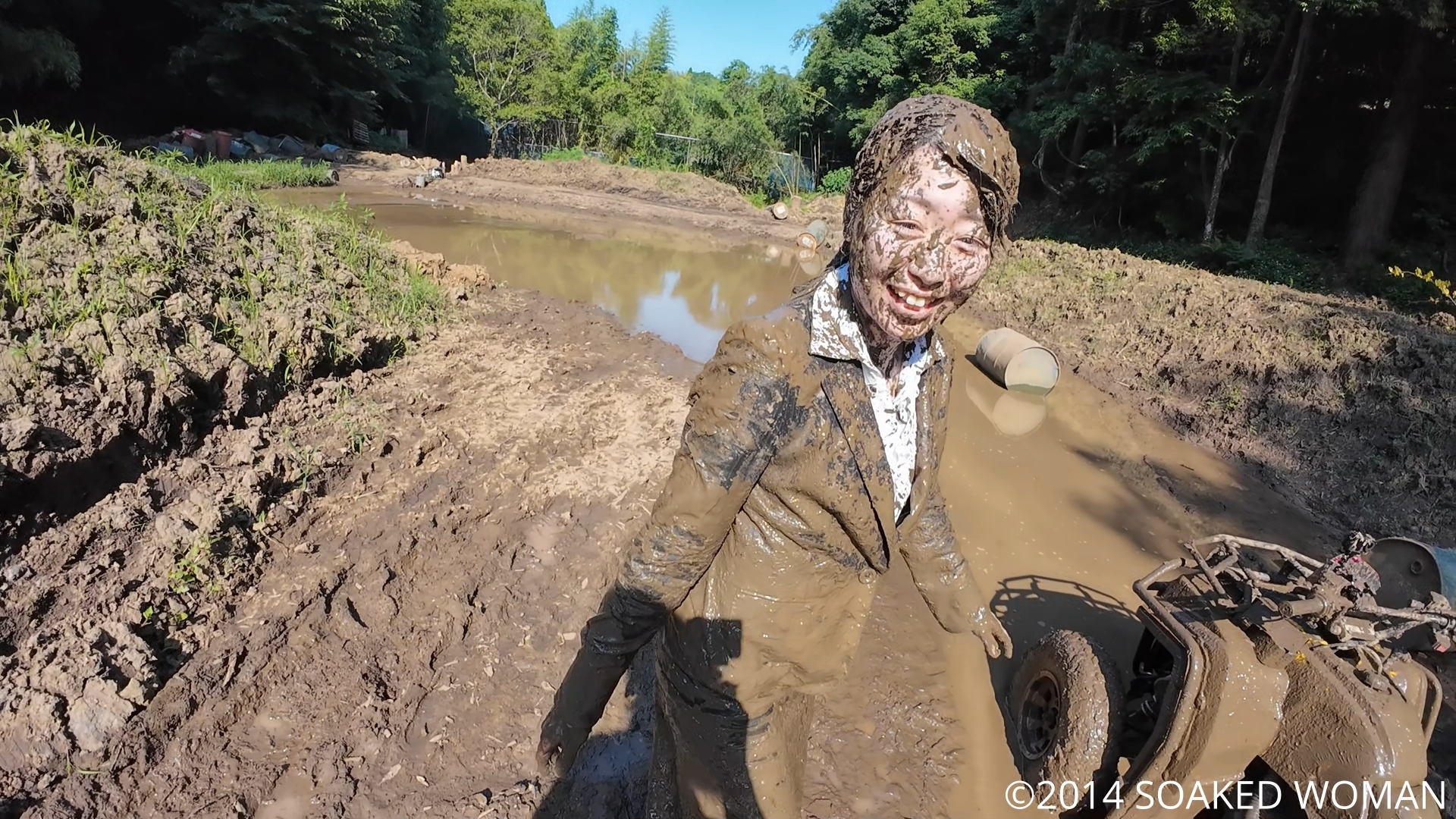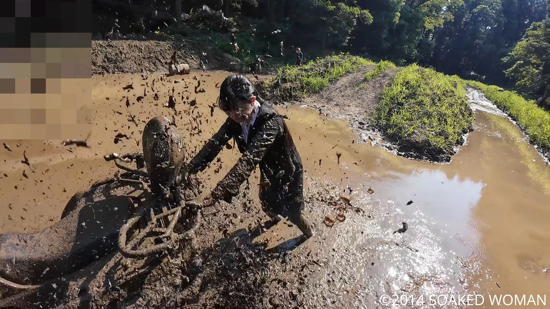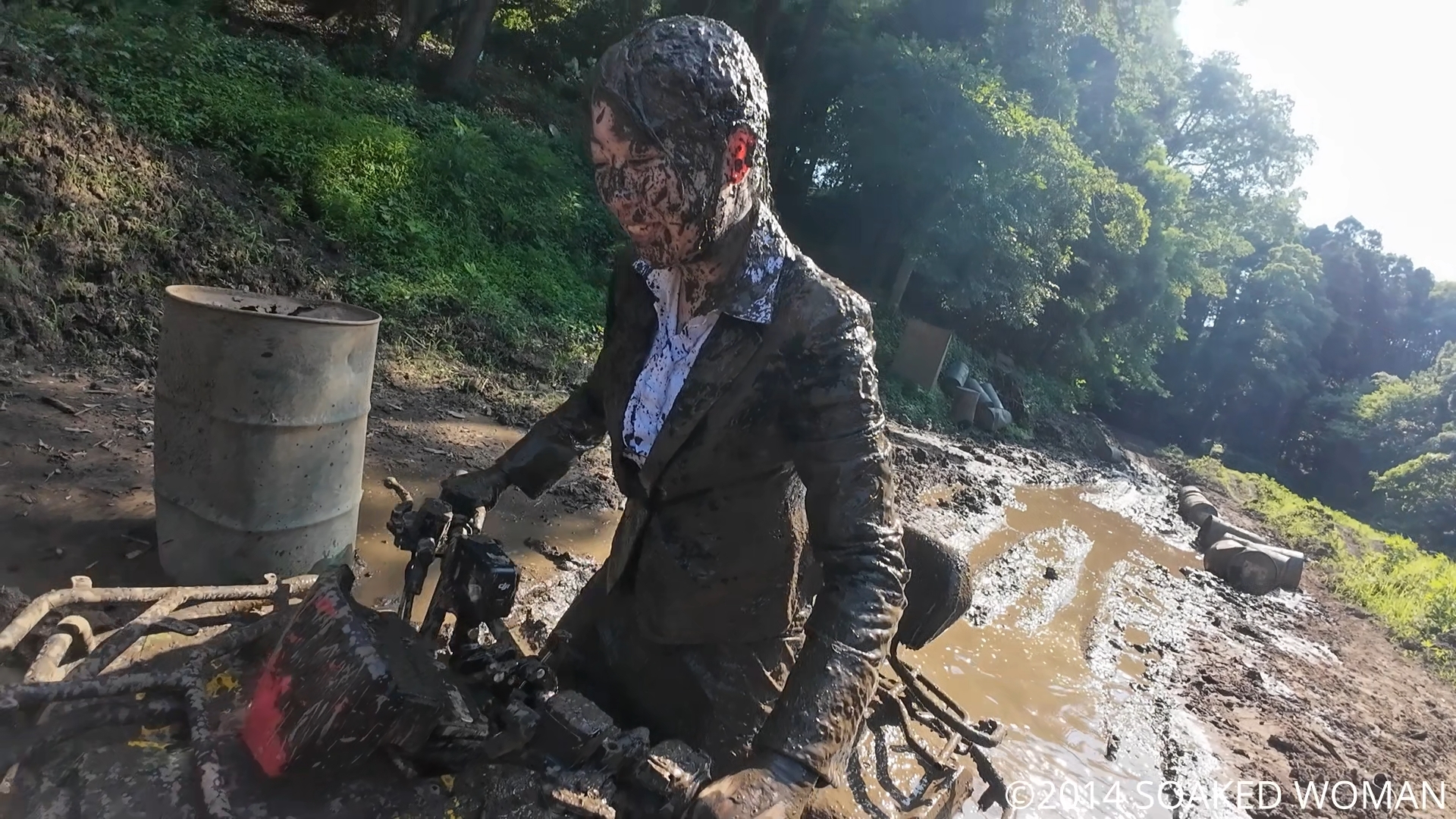 タイヤが巻き上げた泥を何度も全身に浴びるOLさんの姿をご覧ください!